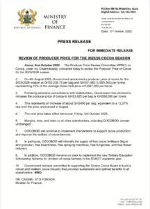 The Government of Ghana has decided to increase the producer price of cocoa to GHS 3,625 per bag or GHS 58,000 per ton. This represents an increase of about GHS400 per bag, equivalent to a 12.27% rise over the price announced in August. The new price takes effect tomorrow, Friday, 3rd October 2025.