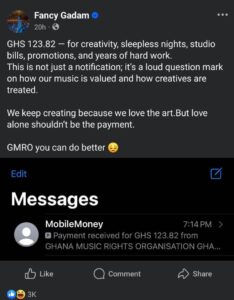 Ghanaian musician Fancy Gadam has raised serious concerns about how the music industry values creative work after revealing a royalty notification of just GHS 123.82.